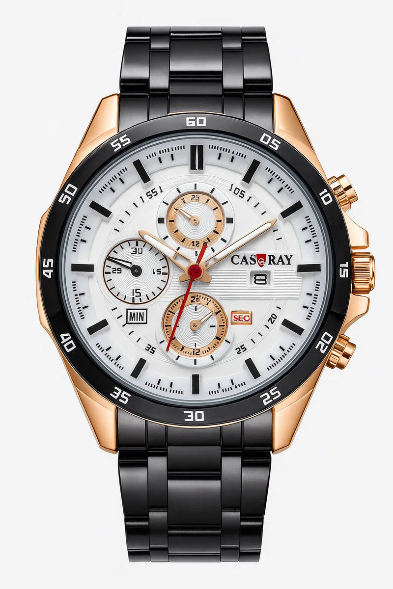 The Casray ChronoMaster Sport is built for those who want power and precision on their wrist. Its bold black-and-gold case houses a crisp white dial with three functional sub-dials for minutes, seconds, and 24-hour tracking. The luminous hands and tachymeter bezel add a professional edge, while the durable stainless steel bracelet ensures lasting strength and comfort. A perfect blend of sport and luxury.