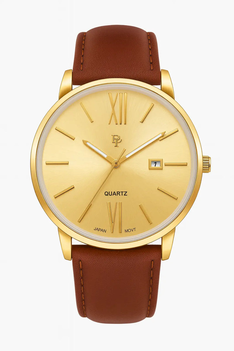 Step into timeless elegance with the Golden Horizon Classic. Featuring a radiant gold dial with Roman numeral accents, this watch blends sophistication with everyday wear. The brown leather strap adds warmth and comfort, while the date display ensures practicality. Powered by precise Japanese quartz movement, it is a refined choice for men who value both style and reliability.